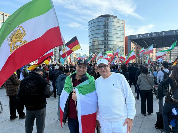 Unter den Teilnehmern der Demo sind auch die beiden Iraner Amir und Kurosh. Sie sind am Samstagnachmittag zum Potsdamer Platz gekommen, um für einen Neuanfang im Iran zu demonstrieren. Als über den Lautsprecher verlautbart wird, dass angeblich auch Ali Chamenei getötet worden sein soll, bricht in der Masse von rund 300 Menschen Jubel aus. „Doch bestätigt wurde das noch nicht“, sagt Kurosh. Er lebt bereits seit 40 Jahren nicht mehr im Iran und auch seine Verwandten leben mittlerweile in Kanada und den USA. Ali Chamenei ist das politische und religiöse Oberhaupt des Irans. Sein Verbleib ist zurzeit unklar.